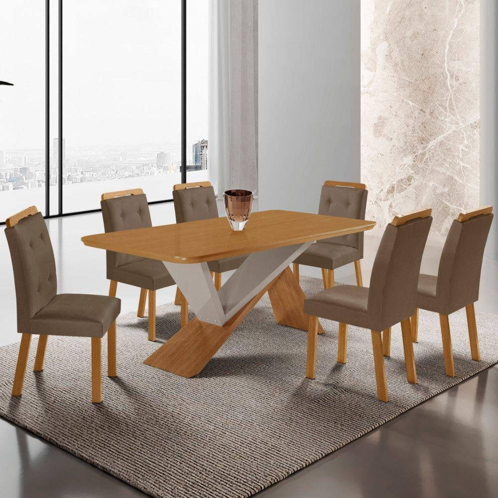 Mesa De Jantar Yasmin 180cm Tampo Mdf Com 6 Cadeiras Carol Veludo Capuccino/naturale/off White
