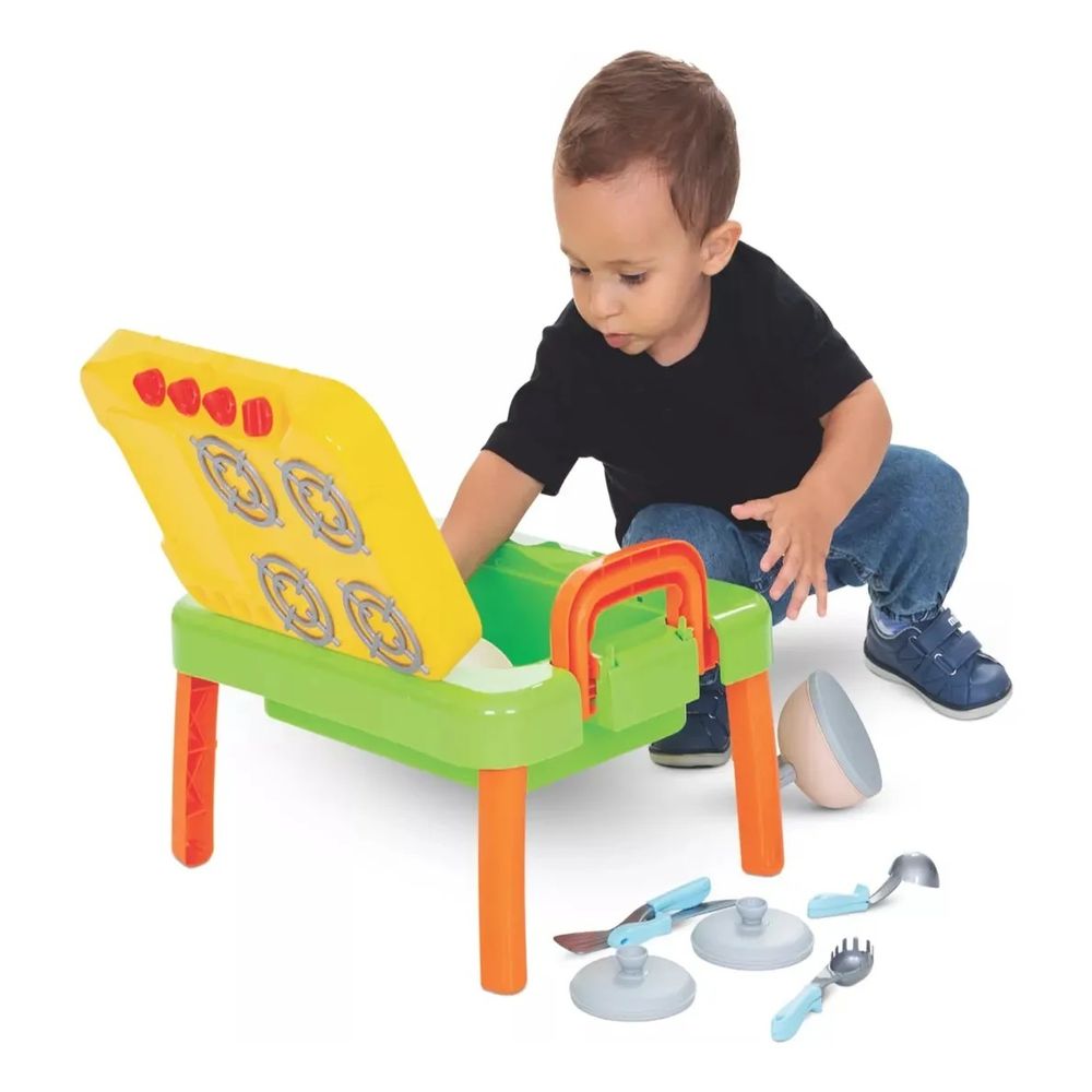 Mesinha Infantil Cozinha Gourmet para Bebês Acima de 1 ano Menino A Mesinha Baby Gourmet é uma mesinha para entrar em outro mundo, o mundo do faz de conta. Com muita diversão, as crianças ficarão encantadas de brincar de cozinhar! Ela conta com botões que simulam o sons de botões de fogões normais (tec-tec); tem 4 bocas de fogão, espaço para corte de alimentos, espaço para utensílios e seu tampo abre. Além disso, ela vem junto com 1 panela de pressão, 1 chaleira, 1 panela, 1 frigideira e 4 utensílios. Ela também acompanha suporte para pendurar os utensílios (com fita dupla-face para colar onde preferir). Tem pés retráteis para facilitar e aumentar a praticidade do seu transporte, levando para onde quiser! Características principais: Idade recomendada: Para bebês acima de 1 ano. Material: Feito com materiais seguros e duráveis, adequados para crianças pequenas. Desenvolvimento: Ajuda no desenvolvimento da coordenação motora fina, habilidades sensoriais e criatividade. Segurança: Conforme com as normas de segurança, garantindo um ambiente seguro para a brincadeira. É um brinquedo que combina diversão e aprendizado, ideal para os primeiros passos na jornada educativa dos pequenos. Faixa Etária: Acima de 1 ano Marca: Mercotoys Categoria: Brinquedos Educativos / Brinquedos 1 Ano / Brinquedos Bebês / Brinquedos 12 Meses Medidas: 53 x 31 x 10 Número de registro/certificação INMETRO 2789/2024
