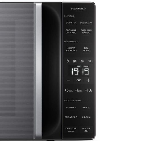 Possui eficiência energética A e função Economia de Energia, que desliga o display quando o micro-ondas não está em uso.