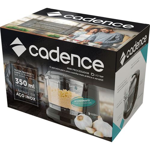 Para quem gosta de praticidade na cozinha, não pode faltar o Mini Processador 350ml Cadence Easy Cut MPR520. Para quem gosta de inovar com praticidade o miniprocessador se torna um aliado no preparo das mais variadas receitas. Compacto, ocupa pouco espaço na sua cozinha, seja na gaveta da cozinha ou na bancada, sempre à mão para triturar, cortar legumes, bater um creme especial. Sua rotina culinária sem dificuldades, pois o mini processador possui um sistema easy, sem botão. É pequenininho mas tem uma potência de 100w de potências e lâminas de aço que transformam seu alimento em poucos segundos. O copo graduado tem capacidade para 350ml ou 350g. Leve, pesa apenas 650g e é muito fácil de manusear e seguro, o aparelho possui trava anti-funcionamento, só funciona se estiver bem encaixado.