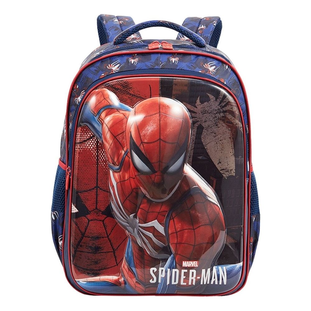 - Design Exclusivo Spider-Man: Frente com PVC metalizado e relevo do Homem-Aranha, capturando toda a ação e coragem do super-herói.