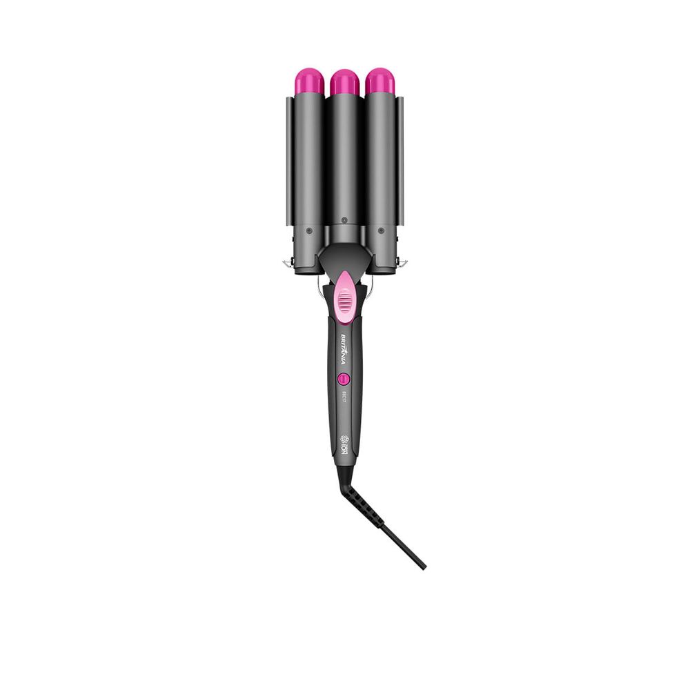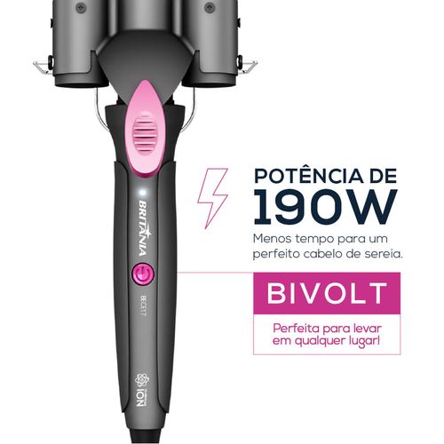 Modelador Triondas Britânia Bivolt 190W Íon Tourmaline BECE17, um jeito rápido e moderno para ondular os seus cabelos! Tenha ondas definidas ou mais soltas no estilo beachwaves, ou seja, aquele visual de “ondas de praia”. São 190W de potência e temperatura de até 230 graus para modelar seus cabelos com mais agilidade e obter o resultado de um cabelo perfeito. As hastes de 32mm em cerâmica do Modelador Triondas evitam o ressecamento e o atrito, protegem do calor e proporcionam um deslize mais suave e rápido nos seus fios. Tudo isso, com muita segurança no manuseio do produto, já que a ponta permanece fria e o cordão giratório garante maior liberdade e facilidade no uso, além de contar com anel para pendurar. O Modelador Triondas Britânia BECE17 é um produto bivolt automático. Sim! Pode ser usado em qualquer lugar e é ideal para levar em viagens. Deseja criar ondas praianas deslumbrantes? Conte com o Modelador Triondas Britânia BECE17!