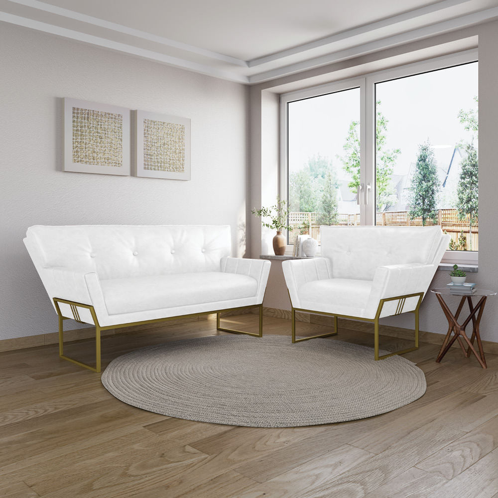 O Sofá Namoradeira e Poltrona Anitta é uma peça que combina beleza, conforto e funcionalidade. Ele tem um design contemporâneo, sofisticado e um revestimento em tecido Sintético PU Branco que harmonizam com qualquer ambiente. Possui uma base industrial dourada com um belo detalhe trabalhado no metal, que além de adicionar um toque de charme à peça, oferece um suporte sólido e seguro, garantindo conforto superior ao sentar. Ideal para sala de estar, recepções, escritórios ou qualquer outro espaço que você queira decorar com estilo e bom gosto. Produzido cuidadosamente em madeira de reflorestamento eucalipto, que garante a resistência e a sustentabilidade do produto. Ele suporta até 180 kg de peso, podendo ser utilizado por pessoas de diferentes biotipos. Ele tem um acabamento reforçado e espuma de qualidade D23, que oferece maciez e aconchego. A almofada fixa do encosto é revestida com fibra siliconada e conta com um detalhe elegante em botonê, que não só valoriza o design, mas também proporciona uma sensação de conforto inigualável. O encosto levemente triangular de ambos adiciona uma estética exclusiva, enquanto os braços, com delicados frisos na costura enriquecem ainda mais o produto. O Sofá Namoradeira e Poltrona Anitta é um kit de alta qualidade, sutileza e versatilidade. Ele é fácil de transportar, pois tem um peso leve e um tamanho compacto. O Sofá Namoradeira e Poltrona Anitta é um produto que vai fazer a diferença na sua decoração e no seu bem-estar. Ele vai trazer personalidade e inovação para o seu ambiente. Aproveite essa oferta e leve para casa um sofá namoradeira e poltrona de qualidade por um preço incrível. Essa é a sua chance de ter um conjunto atraente na sua decoração por um preço imperdível. Corra e garanta o seu antes que acabe o estoque!