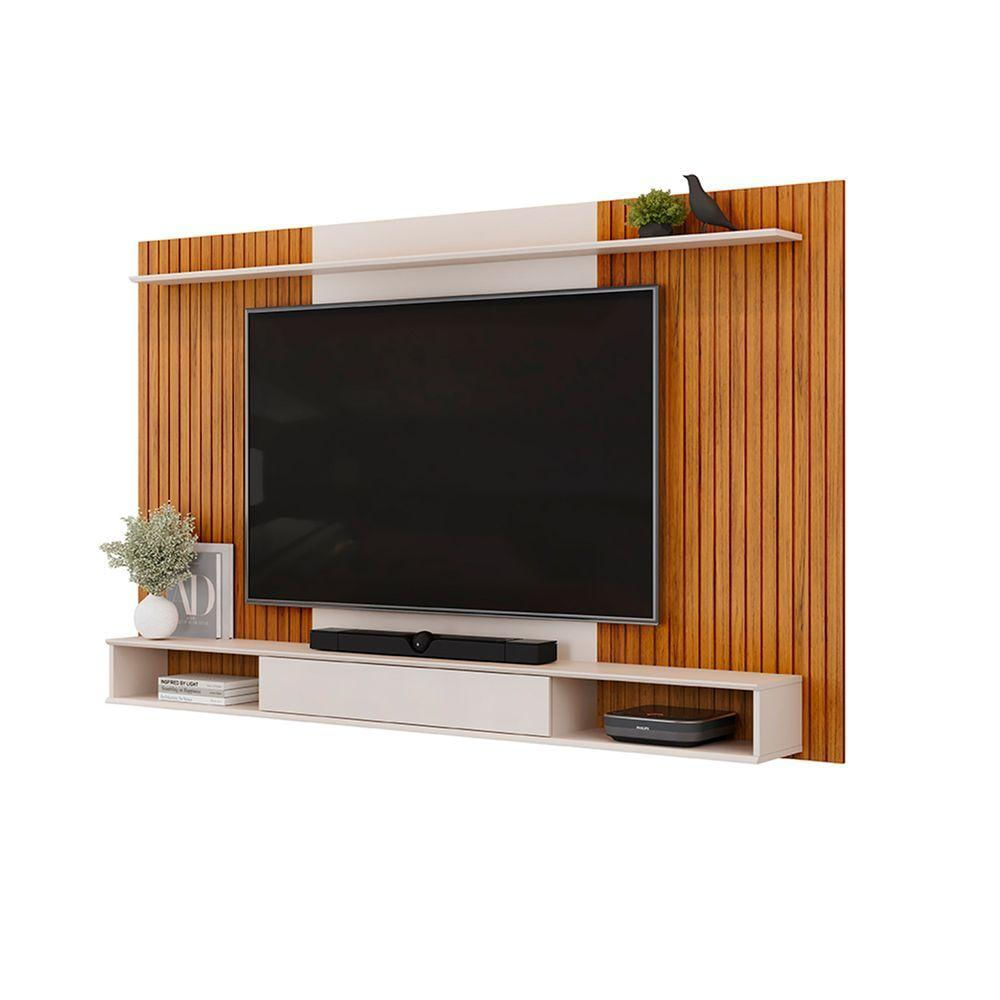Painel Leo Com Ripas E Prateleira Freijó Com Off White
