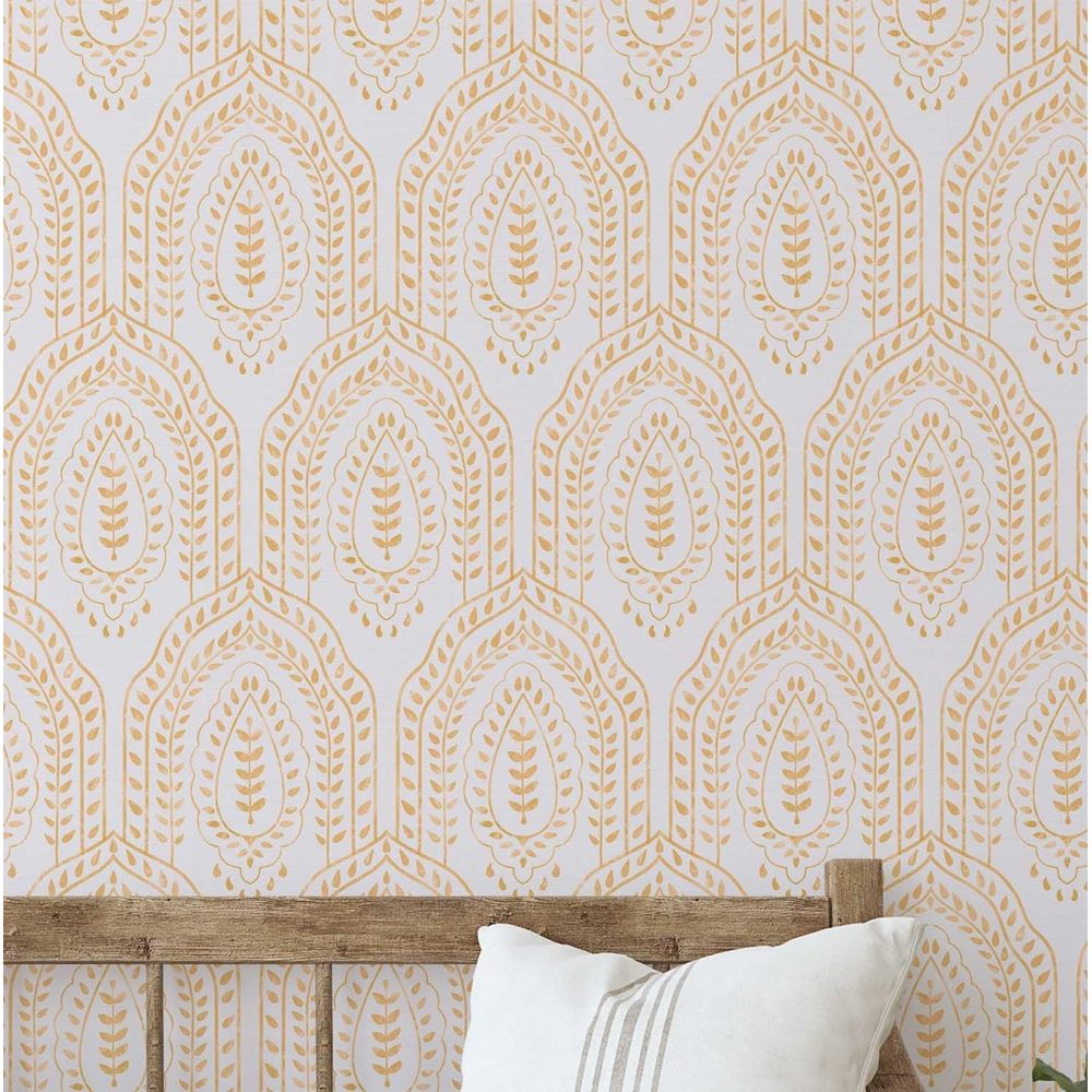 Papel Contact Vinílico Autoadesivo, Urban Chic Paisley Arqueada de Folhas, Amarelo, Impermeável, Removível para Quartos e Sala - S4Sassy 63,5 cm (L) × 152,4 cm (C) / Amarelo - Vinil Liso