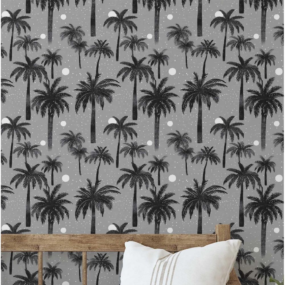 Papel de Parede Tropical Cinza Paraíso das Palmeiras, Vinílico Autoadesivo e Decorativo, DIY Fácil para Quarto, Sala e Ambientes - S4Sassy 63,5 cm (L) × 304,8 cm (C) / Cinza - Vinil Texturizado