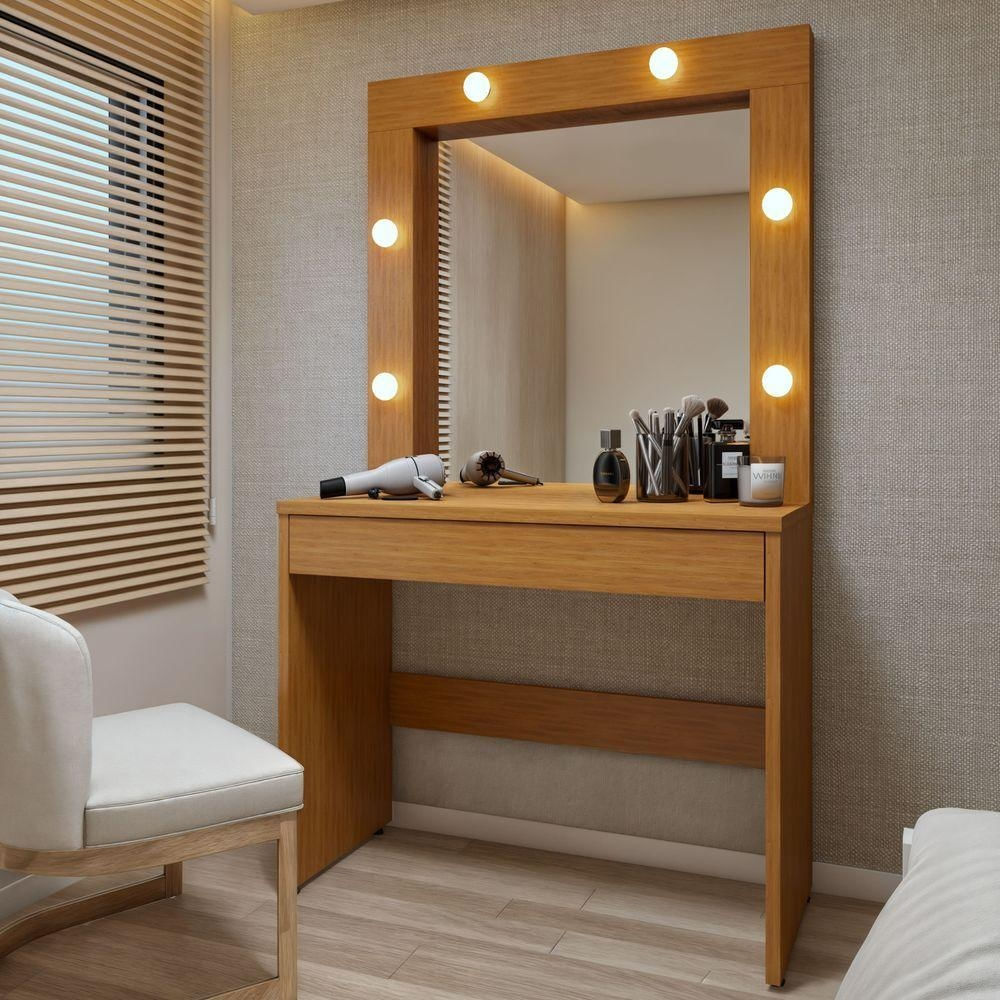 Penteadeira Camarim Com Espelho E 6 Lâmpadas Led Requinte Em Mdf/mdp Naturalle