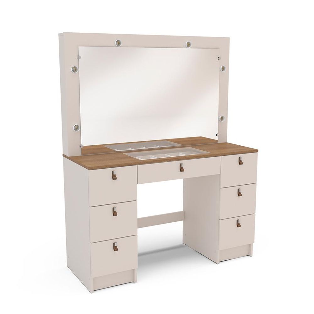 | Material | A Penteadeira França possui estrutura em MDP 15 mm, espelho temperado 3 mm, gavetas com corrediças telescópicas, puxadores sintéticos e acabamento semi fosco |