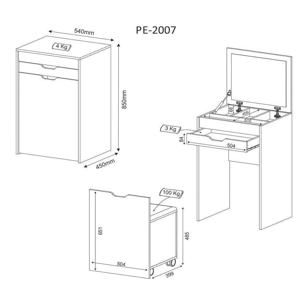 A Penteadeira PE2007 é de grande utilidade após usá-la basta fechar a tampa do espelho e encaixar o puff no espaço abaixo da gaveta, oferece espaços e divisórias para manter suas makes e bijuterias organizadas, possibilitando extrema facilidade e organização na hora de se embelezar. Tem uma beleza encantadora que dará um UP ao ambiente deixando o visual atraente e com muito estilo!Especificações Técnicas:- Marca: Tecno Mobili - Estrutura MDP 15mm - Acabamento em BP e Tecido - Possui Espelho - Puff com Pés de Rodízios - Puxadores Cavados na Peça - Gaveta com Corrediças Metálicas - Tampa da Penteadeira c/ Pistão á gás e Dobradiças Metálicas - Volume: 02 unidades - Possui uma Tampa p/ Abertura c/ Dobradiças Metálicas e Pistão á Gás - Dimensões do Produto (LxAxP): Penteadeira: 54 X 85 x 45 cm - Dimensões do Produto (LxAxP): Puff: 50,4 X 65,1 x 39,9 cm - Peso total dos Produtos: 32,05Kg - Garantia: 3 mesesObservações importantes:- Acompanha manual e todos os acessórios para montagem - Recomendamos que a montagem seja feita por um - As imagens são meramente ilustrativas e não acompanham objetos de decoração e eletros. - Pode haver alguma diferença de tonalidade entre a imagem e o produto, por conta do tratamento de imagens e a calibração de cores da sua tela. - Todos os nossos produtos são enviados devidamente embalados e com total . - Ao receber o produto o cliente deve verificar as condições da embalagem, havendo alguma não assine o de , com a para orientações. - A nossa se responsabilizará pela dos produtos adquiridos até a porta de entrada ou portaria do indicado. - Não nos responsabilizamos, no ato da , por montagens, desmontagens e instalações de produtos, bem como, por subir ou descer escadas/elevadores ou pela utilização de guinchos ou equipamentos es para acesso a pisos superiores em apartamentos, casas ou escritórios. Estas despesas adicionais serão de responsabilidade do cliente. - Confira as dimensões do produto no o da compra e certifique-se de que passará normalmente por elevadores, portas, escadas e/ou corredores, evitando assim futuros desagrados ou imprevistos com a do produto.