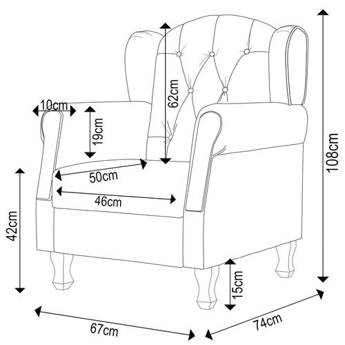 Outras Medidas: Largura Interna do Assento: 46 cm. Altura do Chão até o Assento: 42 cm. Altura do Encosto: 62 cm. Profundidade Interna do Assento: 50 cm. Altura do Braço: 19 cm. Altura dos Pés: 15 cm.