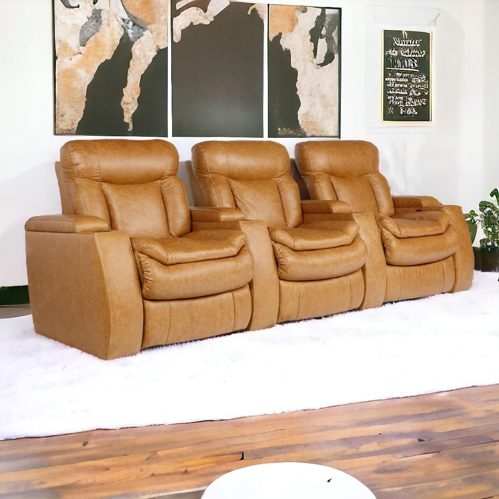 Poltrona do Papai Tripla Reclinável Sala de Cinema Elétrica Porta-Copos LED Yellowstone Couro Caramelo G86 - Gran Belo