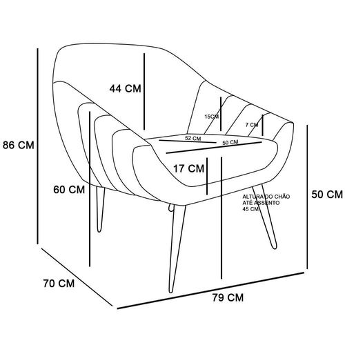 Altura total:86 cm Largura total:79 cm Profundidade total:70 cm Altura do encosto:44 cm Largura do assento:50 cm Profundidade do assento:52 cm Altura do chão ao assento:45 cm Espessura do assento:17 cm Altura do chão ao braço:50 cm Altura interna do braço:15 cm Tamanho dos pés:30 cm Espessura do braço:9 cm Peso:14 kg