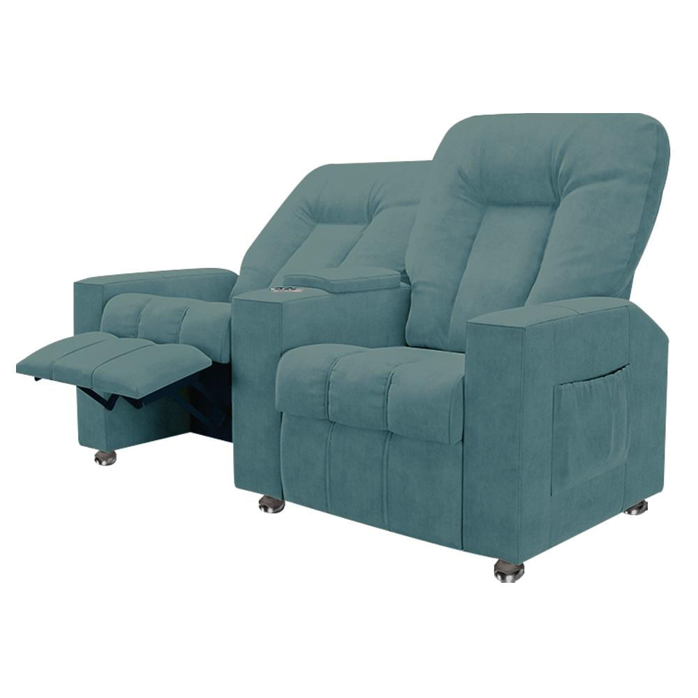 Desenvolvida para superar as suas expectativas, a Poltrona Reclinável 2 Lugares, veio para trazer a experiência cinematográfica sem você sair do conforto de seu lar. Esta poltrona é uma excelente escolha para qualquer ambiente, seja ele sua sala de estar, quarto ou até mesmo sala de cinema, além disso, a poltrona é feita com materiais de alta qualidade, garantindo durabilidade e resistência para longas horas de uso. Uma peça única, confortável e pronta para você. Não perca tempo, adquira já a sua. Dimensões do Produto (L x A x P) 160 cm x 110 cm x 98 cm Profundidade Aberto: 148 cm Altura do Encosto: 70 cm Altura do Assento: 45 cm Largura do Assento: 52 cm Profundidade do assento: 50 cm Características: Estrutura em madeira de reflorestamento de eucalipto e MDF. Encosto reclinável com fibra siliconada. Assento reclinável com espuma D-26. Braça com espuma D-20. Possui mecanismo de 02 estágios e 03 posições. Contém porta copo nas braças e revisteiro na lateral. Pés em madeira revestidos em alumínio. Revestimento em Veludo na cor Azul Claro. Suporta 110 Kg por assento. - A tonalidade do produto real poderá ter ligeira variação devido o lote de tecidos. - A limpeza deve ser feita com pano levemente umedecido em água limpa, sem esfregar, não utilizar produtos abrasivos, desengordurantes, álcool ou solvente.. Observações importantes: - Produto para uso em ambiente interno, não devendo ficar exposto diretamente ao sol, calor e umidade excessivos. - Pode haver alguma diferença de tonalidade entre a imagem e o produto real, por conta do tratamento de imagens e a calibração de cores do seu monitor. - As imagens são meramente ilustrativas, não acompanham objetos de decoração e eletrônicos. - Ao receber a mercadoria, o cliente deve verificar as condições da embalagem, caso haja alguma avaria não assine o comprovante de recebimento. - Montagem, desmontagem e outras instalações serão de responsabilidade do cliente. Não nos responsabilizamos, no ato da entrega, por subir escadas/elevadores ou pelo transporte por guincho em apartamentos. Eventuais despesas são de responsabilidade do comprador. - Confira as dimensões do produto e certifique-se de que passará normalmente por supostos elevadores, portas, escadas e/ou corredores de sua residência.