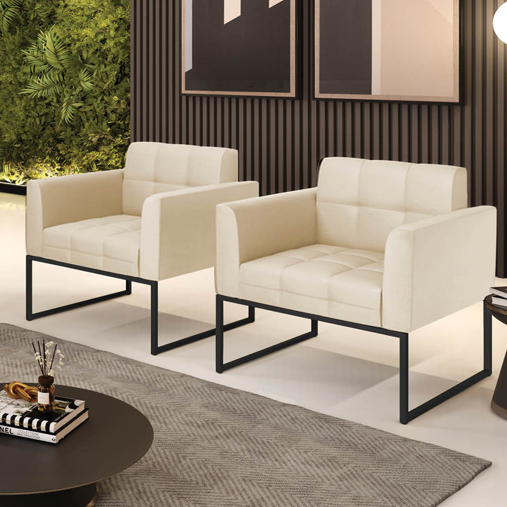 Poltrona Sala Decorativa Kit 2 Elisa Base Industrial Preta Sintético PU Bege D03 - D'Rossi