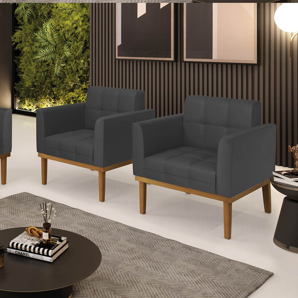 Poltrona Sala Decorativa Kit 2 Elisa Base Madeira Castanho Sintético Grafite D03 - D'Rossi