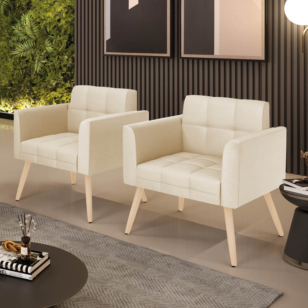 Poltrona Sala Decorativa Kit 2 Elisa Pé Palito Natural Sintético PU Bege D03 - D'Rossi