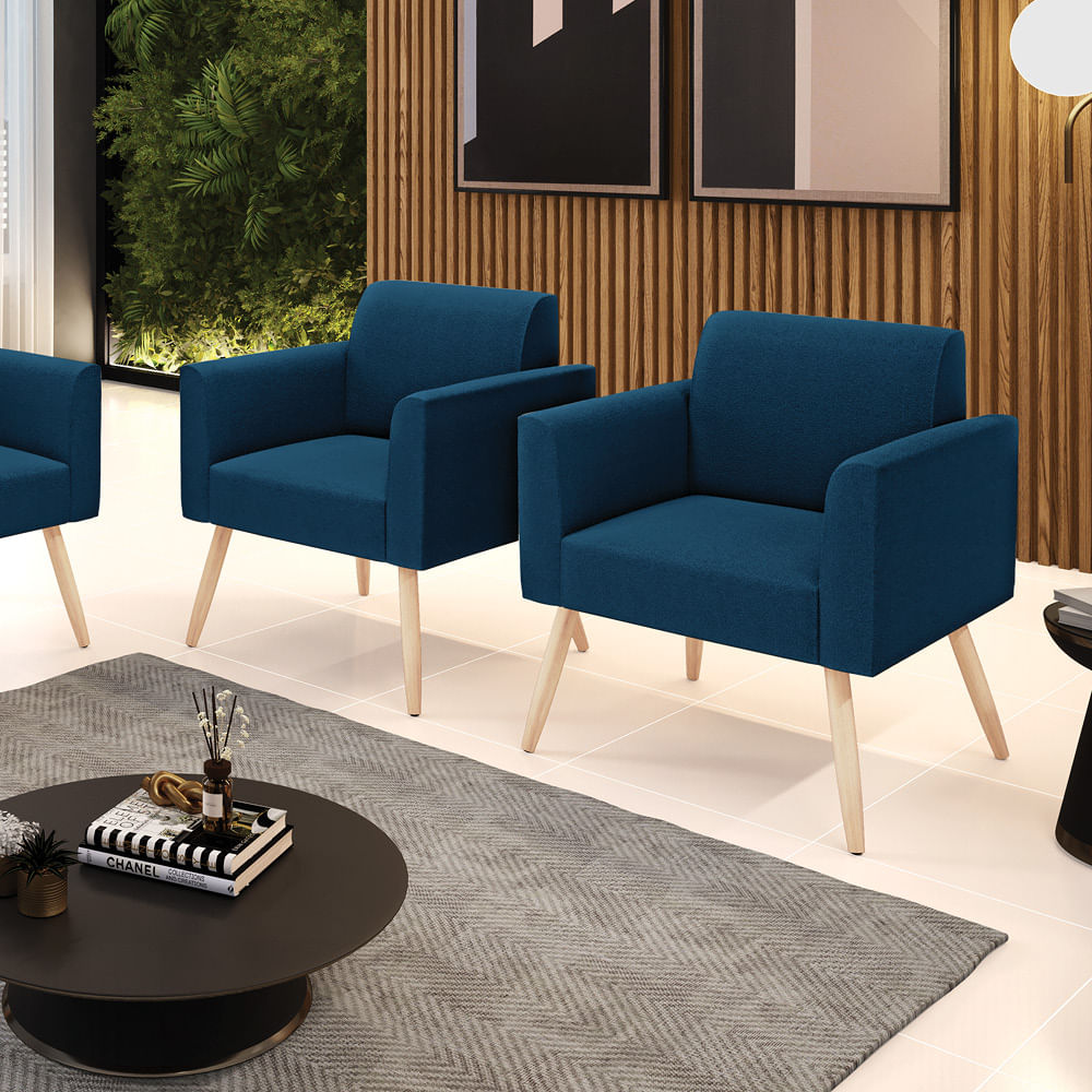 A Poltrona Marisa é a escolha perfeita para quem deseja unir conforto e comodidade em um estilo elegante. Com um design único, ela possui Pés Palito Natural que harmoniza com o seu belíssimo tom Azul, criando uma combinação elegante de conforto e estilo. Ela é perfeita para quem busca móveis que não só sejam bonitos, mas que também proporcionem bem-estar. Ideal para compor salas de estar, recepções, bibliotecas, salas de leitura, espaços de design e até áreas comerciais, essa peça versátil é pensada para ambientes que excluam beleza e aconchego. Sua estrutura, em madeira de reflorestamento de eucalipto, oferece resistência e sustentabilidade, suportando até 120 kg, garantindo segurança para usuários de diferentes biotipos. O conforto é outro destaque, com estofado em espuma prorelax D-23, que proporciona suporte e maciez ideais. Revestida em Bouclê, um tecido maleável e sofisticado, a Poltrona Marisa segue a tendência do momento com um toque suave e quente, remetendo à textura natural da lã. Leve e fácil de transportar, a Poltrona Marisa é um item que agrega charme e durabilidade ao seu espaço. Não perca a oportunidade de adquirir essa peça exclusiva que fará toda a diferença na sua decoração e no seu bem-estar. Aproveite agora! OBSERVAÇÃO IMPORTANTE: A entrega é realizada no endereço informado, não realizamos o transporte para andares superiores, como subir escadas, elevadores ou guinchos. Não realizamos montagens, desmontagens ou instalações. Todos esses serviços são de responsabilidade do comprador. Dimensões do Produto: Altura Total: 81 cm Largura Total: 64 cm Profundidade Total: 64 cm Peso: 14 kg Outras medidas: Altura do Encosto: 36 cm Largura do Assento: 47 cm Profundidade do Assento: 48 cm Altura do chão ao Assento: 45 cm Espessura do Braço: 9 cm Altura interna do Braço: 20 cm Espessura do Assento: 18 cm Tamanho dos pés: 30 cm Especificações do Produto: Estrutura: Madeira de Reflorestamento de Eucalipto Espuma: D-23 Tecido: Bouclê Peso Suportado: Até 120 Kg Tipo de Pés: Pés Palito de Madeira Tipo de Encosto: Fixo Tipo de Assento: Fixo Complexidade da Montagem: Baixo Montagem: O produto vai montado, apenas rosquear os pés Garantia: 90 dias contra defeito de fabricação Instruções de Limpeza: Utilizar um pano limpo e levemente úmido Você irá Receber: 02 Poltronas - Entregue em: 02 Volumes