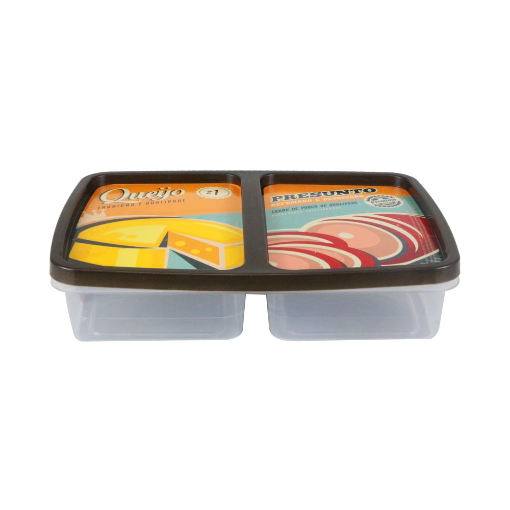 Pote com tampa com indicativo para quejo e presunto, possui divisória no meio.