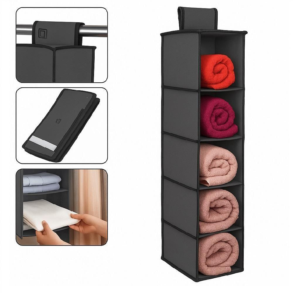 Com 5 divisórias espaçosas, ela é perfeita para guardar roupas, sapatos, toalhas, bolsas e acessórios, mantendo tudo em ordem e de fácil acesso.
