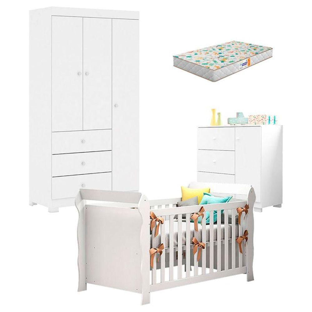 Quarto de Bebê Duda 3 Portas e Berço Americano Lara Branco Brilho com Colchão Gazin – Phoenix BabyA mamãe está montando o quartinho do seu bebê? Então apresentamos para você este belo conjunto composto pelo berço americano da linha Lara fabricado pela Carolina acompanhado do colchão Gazin, cômoda e guarda roupa 3 portas da linha Duda fabricado pela Phoenix Baby. O berço pode virar mini cama, acompanhando a fase de crescimento do seu bebê, e prolongando sua vida útil. A cômoda possui três gavetas e uma porta. Completando o conjunto, o guarda roupa conta com três portas e três gavetas. Proporcionando um ótimo espaço interno para a mamãe acomodar melhor as roupinhas e acessórios, livrando de bagunças e mantendo o ambiente organizado. Desenvolvidos em MDP/ MDF da mais alta qualidade, garante durabilidade e resistência. Sendo o conjunto ideal para acompanhar todas as fases de crescimento do seu filho. Além disso, foi cuidadosamente projetado para combinar com qualquer ambiente. Confira as características:Características Técnicas:Berço Americano Lara Branco Brilho - Carolina- Desenvolvido em MDF/MDP - Pintura na cor Branco Brilho - Pintura e acabamento em U.V que não faz mal a saúde do bebê - Alta Resistência - Superfícies e bordas lisas e retas - Estrado em madeira maciça com duas alturas de regulagem - Padrão americano - Acompanha suporte mosquiteiro - Indicado colchão 70x130 cm - Função mini cama e sofá cama aumentando a vida útil do móvel - Maior segurança para o seu bebê - Lindo design Dimensões: Altura: 90 cm Largura: 154 cm Profundidade: 78 cmCômoda Infantil Duda Branco Brilho – Phoenix Baby- Desenvolvido em 100% MDF de 12/15mm - Sistema de pintura atóxica, que não faz mal ao bebê - Acabamento em UV brilho - Possui 3 gavetas - Possui 1 porta - Corrediças telescópicas - Puxadores em PVC - Lindo designDimensões: