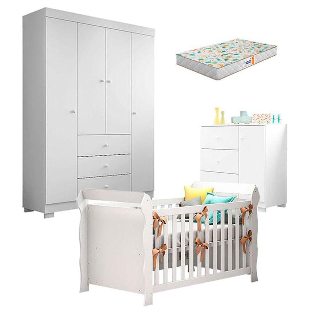 Quarto de Bebê Duda 4 Portas e Berço Americano Lara Branco Brilho com Colchão Gazin – Phoenix BabyComeçou a montar o quartinho do seu bebê? Então apresentamos para você este belo conjunto composto pelo berço americano da linha Lara fabricado pela Carolina acompanhado do colchão Gazin, cômoda e guarda roupa 4 portas da linha Duda fabricado pela Phoenix Baby. O berço pode ser utilizado como mini cama, conforme seu bebê vai crescendo, prolongando sua vida útil. A cômoda possui três gavetas e uma porta. Completando o conjunto, o guarda roupa conta com quatro portas e três gavetas. Com amplo espaço interno traz mais praticidade para a mamãe acomodar as roupinhas e acessórios. Desenvolvidos em MDP/ MDF de alta qualidade, garante mais durabilidade e resistência. Esse conjunto traz sofisticação para seu ambiente. Além disso, foi cuidadosamente projetado para acompanhar todas as fases de crescimento do seu filho. Confira as características:Características Técnicas:Berço Americano Lara Branco Brilho - Carolina- Desenvolvido em MDF/MDP - Pintura na cor Branco Brilho - Pintura e acabamento em U.V que não faz mal a saúde do bebê - Alta Resistência - Superfícies e bordas lisas e retas - Estrado em madeira maciça com duas alturas de regulagem - Padrão americano - Acompanha suporte mosquiteiro - Indicado colchão 70x130 cm - Função mini cama e sofá cama aumentando a vida útil do móvel - Maior segurança para o seu bebê - Lindo design Dimensões: Altura: 90 cm Largura: 154 cm Profundidade: 78 cmCômoda Infantil Duda Branco Brilho – Phoenix Baby- Desenvolvido em 100% MDF de 12/15mm - Sistema de pintura atóxica, que não faz mal ao bebê - Acabamento em UV brilho - Possui 3 gavetas - Possui 1 porta - Corrediças telescópicas - Puxadores em PVC - Lindo designDimensões: