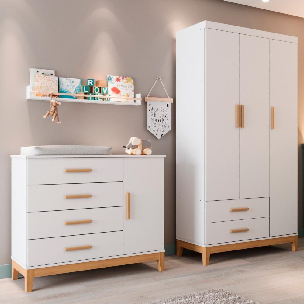 Quarto De Bebê Retrô Guarda Roupa 3 Portas Cômoda 4 Gavetas Com Porta Helen Branco Carolina Baby