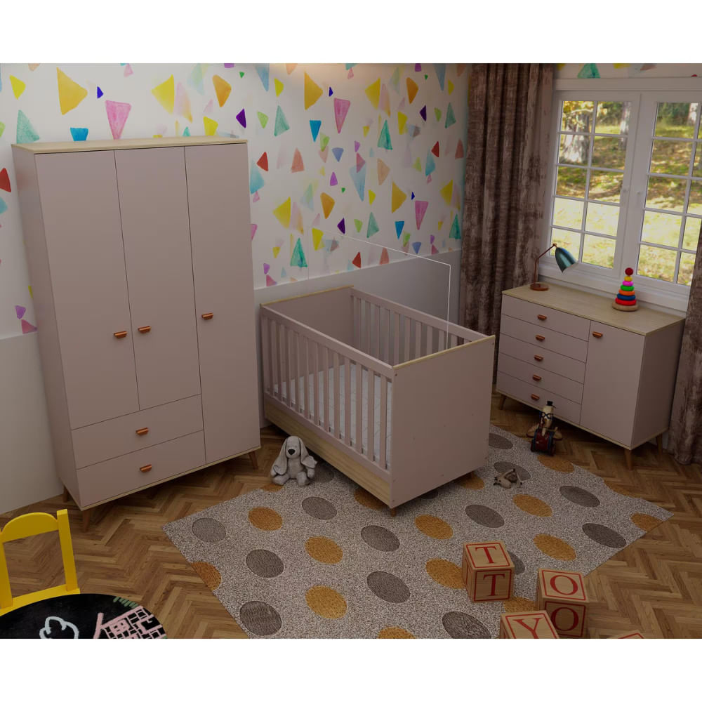 Crie um quarto infantil completo, seguro e cheio de estilo com o Conjunto Ternura da Bartira. Este kit inclui três móveis essenciais: Guarda-Roupa com 3 portas e 2 gavetas, Cômoda com 5 gavetas e 1 porta e o versátil Berço 2 em 1 Ternura Plus, que se transforma em mini cama para acompanhar o crescimento do seu bebê.