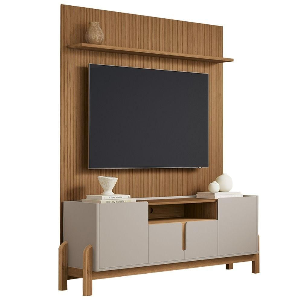 O conjunto Painel Sena e Rack Bancada Luiza é ideal para quem busca requinte e modernidade na decoração, oferecendo um upgrade visual e funcional. O Painel Sena se destaca pelo acabamento frisado que simula a sofisticação da madeira ripada, adicionando textura e profundidade ao ambiente. Além de criar uma base elegante para a TV, ele conta com uma prateleira superior integrada, tornando-o uma peça central e versátil para decorações. O Rack Bancada Luiza complementa com elegância contemporânea e minimalista, apresentando base e laterais em MDF com cantos arredondados. Suas portas em MDF usinadas utilizam um detalhe curvo para abertura (eliminando puxadores externos) e possuem sistema soft-close para fechamento macio e silencioso. A estrutura é suportada por pés de madeira maciça, garantindo estilo, organização e durabilidade para eletrônicos e decorações.