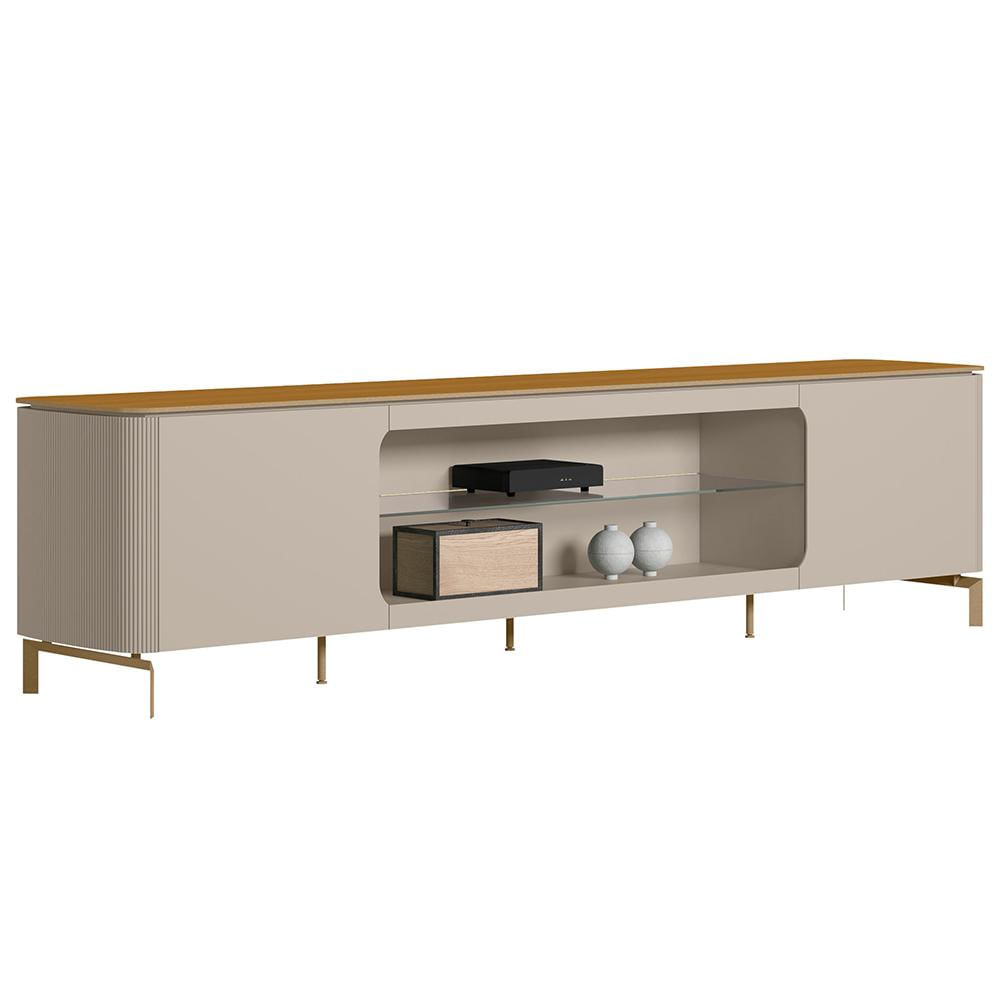 Além disso, os pés metálicos dourados adicionam um charme industrial elegante, unindo o rústico ao sofisticado em uma harmoniosa composição. Para completar, os nichos centrais não apenas embelezam, mas também oferecem praticidade, servindo como suporte para aparelhos eletrônicos ou itens decorativos que expressam seu bom gosto e estilo.