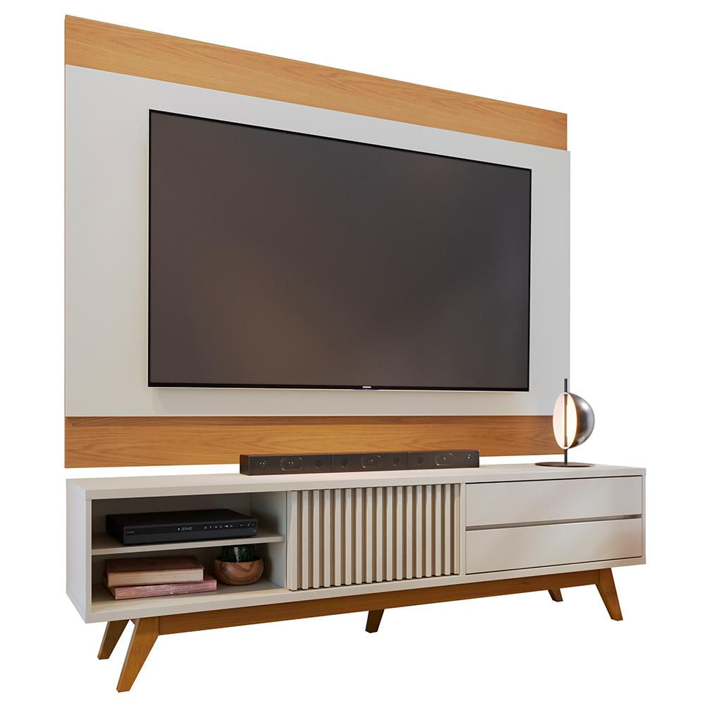 Com um design moderno, que combina tonalidades e elementos, esse rack com painel harmoniza facilmente com diversos estilos de decoração. O rack bancada com pés em madeira maciça e detalhe ripado na porta conferem charme ao mesmo tempo que dispõe de amplo espaço de armazenamento interno, a fim de manter o tampo sempre organizado. Já o painel com linhas retas e design minimalista, completa o ambiente e ganha vida ao emoldurar TVs de até 75 polegadas, deixando os momentos de entretenimento muito mais convidativo.