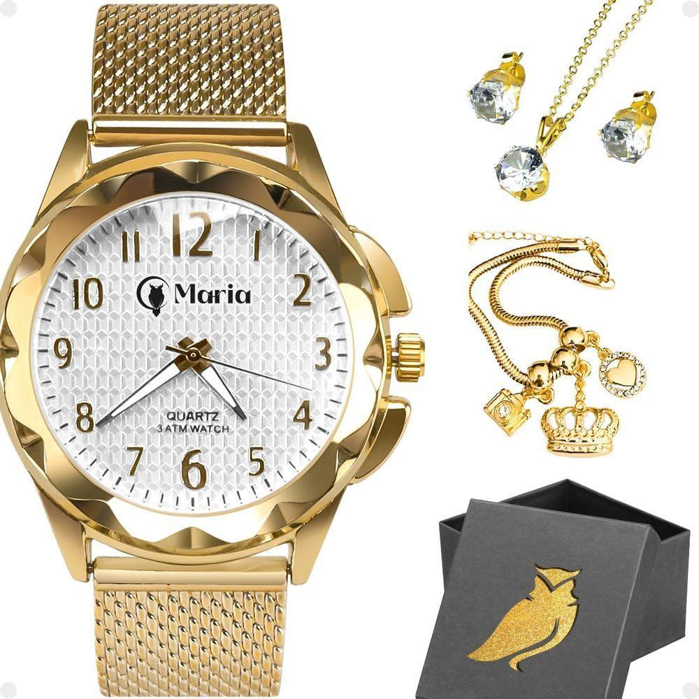 Relogio Aço Inox Banhado Feminino + Caixa + Colar Pulseira Original Presente Silicone Social Coruja