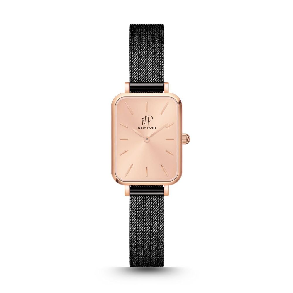 O Relógio Feminino New Port Quadrado Vermont Black Fundo Rosé Gold, com sua pulseira de aço inoxidável preta, apresenta dimensões de 20x26mm. A caixa é elaborada em metal rosé gold, com o mostrador também em rosé gold, que é protegido por um vidro de mineral resistente.