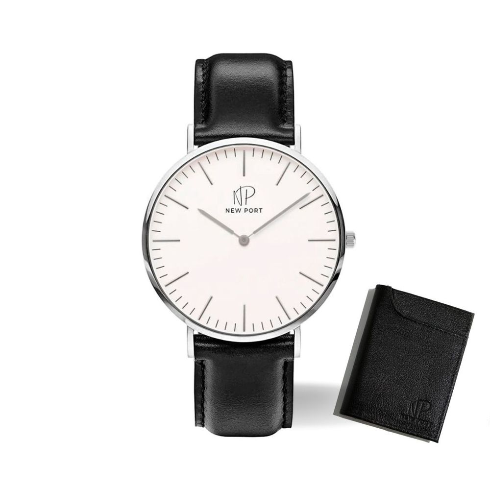 Elegância e praticidade se unem neste exclusivo kit da New Port. Relógio Masculino New Port Preto Pulseira De Couro Vegano Riverside Minimalista 40mm de diâmetro. A caixa é de metal prateada e o mostrador branco, vidro com mineral endurecido com alta resistência.