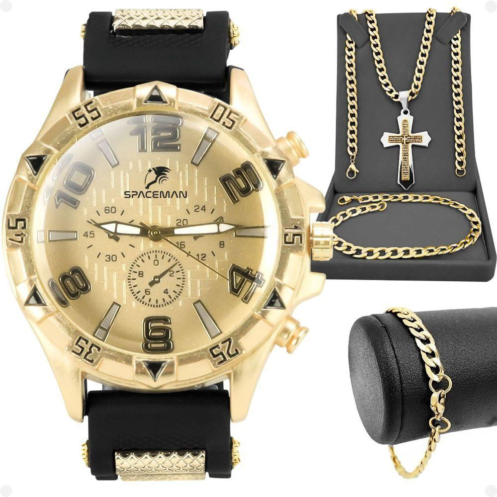 Relogio Masculino Prova Dagua Dourado + Cordão + Crucifixo Grande Pesado Aço Inoxidável Presente