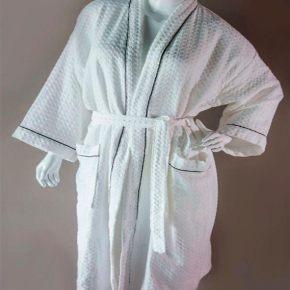 O Roupão Formah é confeccionado em tecido Piquet 100% algodão, na cor branca, gramatura de 306g/m² e costura em alto padrão. Conta com bolsos frontais, cinto para ajuste, gancho na gola para pendurar e manga 7/8 Disponível no tamanho: GG ? viés preto- veste do 42 ao 48 aproximadamente.