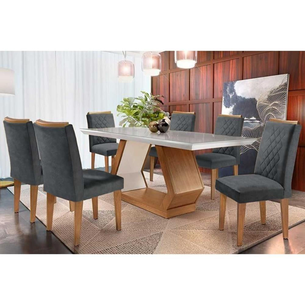 Sala De Jantar Completa Alvorada Tampo Madeirado C/ Vidro Canto Reto 180x90cm E 6 Cadeiras Jade Imbuia/off White - Linho Grafite - Rufato