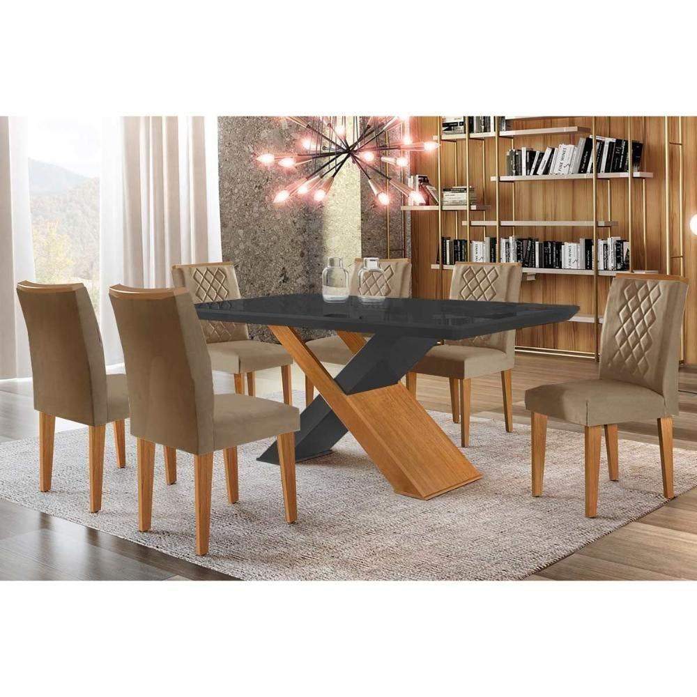 Sala De Jantar Completa Imperatriz Tampo Madeirado C/ Vidro Canto Curvo 180x90 E 6 Cadeiras Jade Imbuia/grafite - Suede Capuccino - Rufato