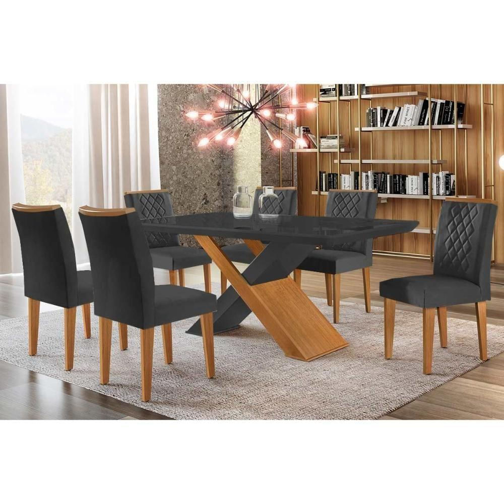 Sala De Jantar Completa Imperatriz Tampo Madeirado C/ Vidro Canto Curvo 180x90 E 6 Cadeiras Jade Imbuia/grafite - Suede Grafite - Rufato