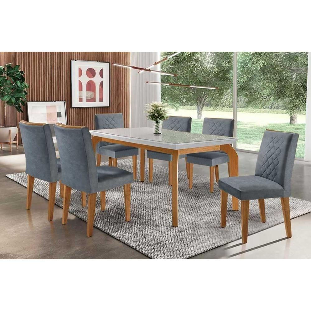 Sala De Jantar Completa Londrina C/ Tampo Madeirado Vidro Canto Reto 180x90cm E 6 Cadeiras Jade Imbuia - Veludo Grafite - Rufato