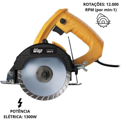 CARACTERÍSTICAS: A Serra Mármore WAP ESM1300 é uma ferramenta potente de 1300W, projetada para cortes precisos em pedras, tijolos, telhas e cerâmica. Possui regulagem de profundidade sem ferramentas, botão de trava para uso contínuo e proteção contra poeira. Robusta e durável, é ideal para trabalhos profissionais.