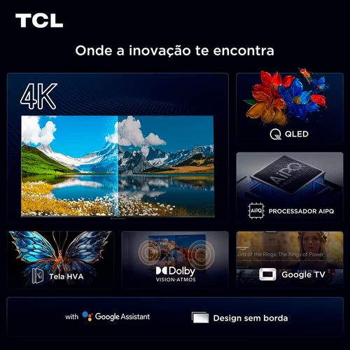 No áudio, o Dolby Atmos e o DTS Virtual:X criam uma atmosfera sonora tridimensional que transforma qualquer cena em uma experiência imersiva. Já com o sistema operacional Google TV, comandos de voz via Google Assistant e Googlecast integrado, você tem controle total e fácil conectividade. E mais: com controle inteligente de dispositivos TCL e proteção ocular avançada, a experiência é completa, segura e confortável.