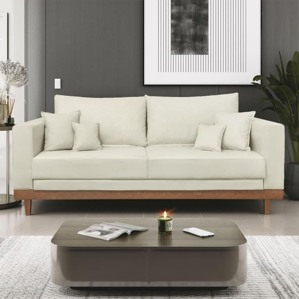 Sofá 3 Lugar Base Reforçada Madeira Tecido Suede + Almofada Bege