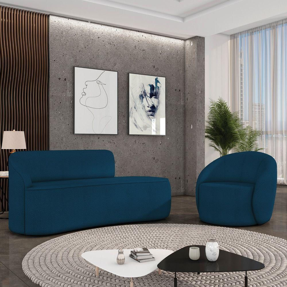 Sofá 3 Lugares Orgânico 180cm Morgan E Poltrona Lua Bouclê Azul D03 - D'rossi