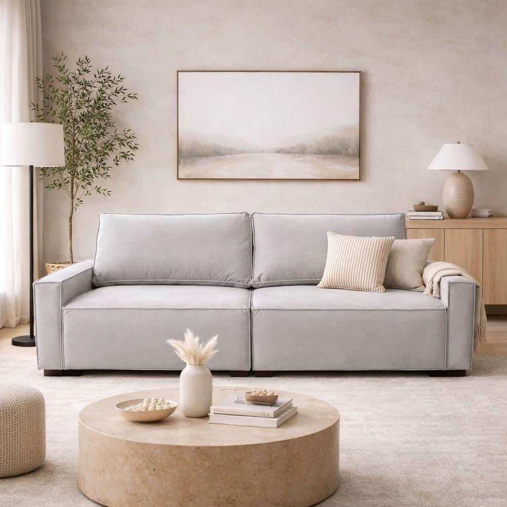 Sofá Contemporâneo com Design Moderno e Conforto para Sala de EstarEste sofá contemporâneo de 3 lugares, composto por 2 módulos, é a escolha ideal para quem busca um móvel funcional, elegante e confortável para a sala de estar. Seu design moderno, com linhas retas e visual equilibrado, proporciona harmonia ao ambiente e facilita a composição com diferentes estilos de decoração.O estofado confortável e as almofadas amplas oferecem excelente experiência de uso, tornando o sofá perfeito para momentos de descanso e convivência. Sua configuração modular permite melhor adaptação ao espaço, enquanto a estrutura resistente garante durabilidade e estabilidade, atendendo às exigências do uso diário.Indicado para salas modernas, ambientes integrados e projetos contemporâneos, este sofá une conforto, design e versatilidade, valorizando o espaço com uma estética atemporal e sofisticada.ESPECIFICAÇÕES:Estrutura em Madeira Eucalipto resistente e durável.Assento revestido em linho de alta qualidade.Design moderno, minimalista e fácil de combinar.Ideal para sala, recepção, sala de estar.DIMENSÕES:Largura total: 2,004 m