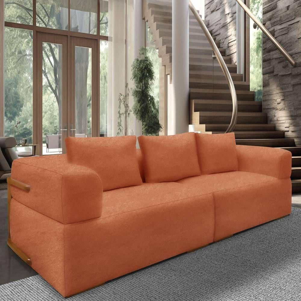 Sofá 4 Lugares 2,80m Em Tecido Bouclé Com Aplique Em Madeira – Scott Lucadi Terracota