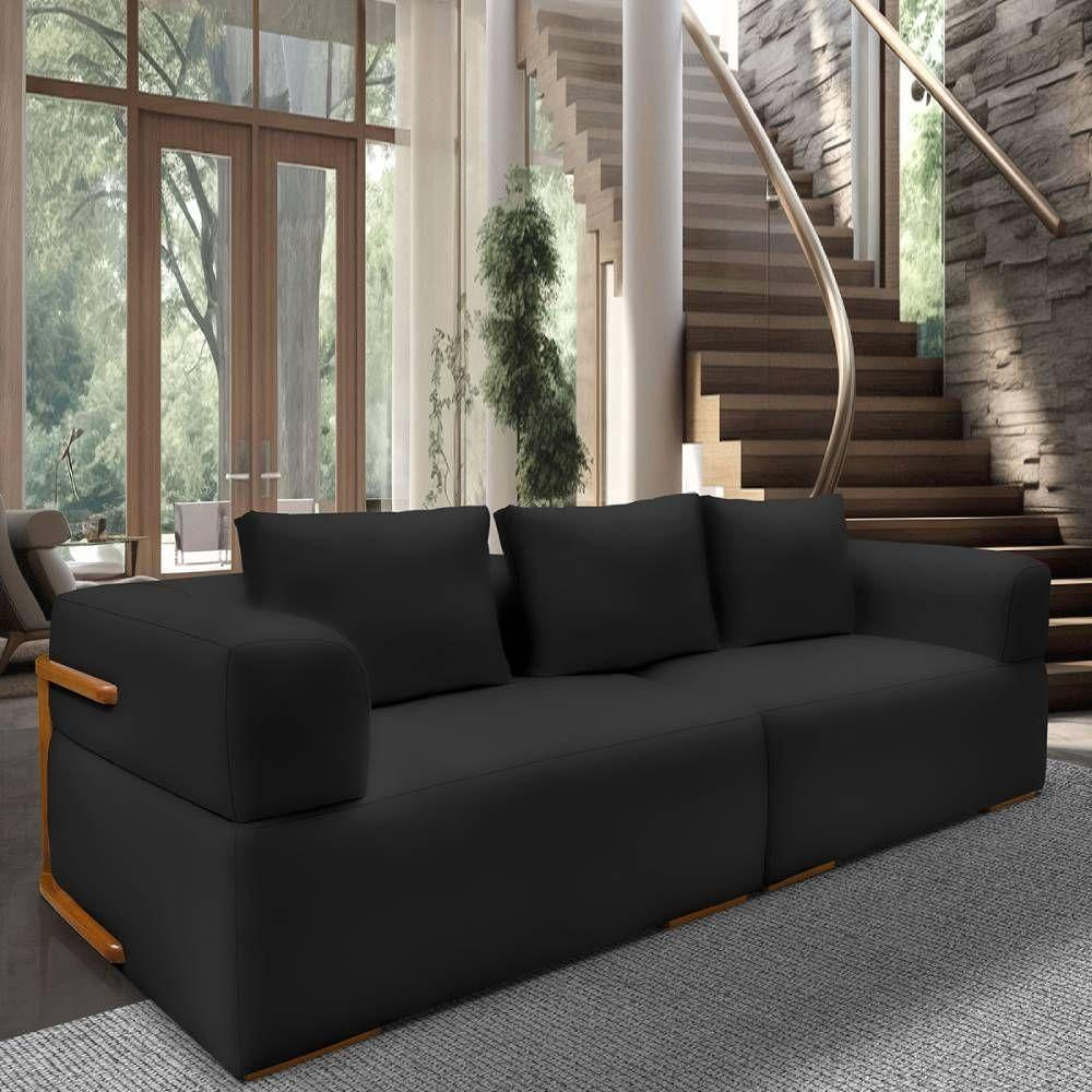 Sofá 4 Lugares 2,80m Em Tecido Veludo Com Aplique Em Madeira – Scott Lucadi Preto