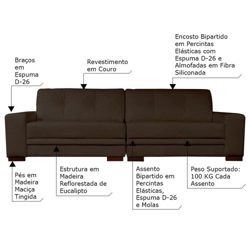 Características do Produto: Material da Estrutura: Madeira Reflorestada de Eucalipto; Encosto: Percintas Elásticas, Espuma D-26 e Almofadas em Fibra Siliconada; Assento: Percintas Elásticas, Espuma D-26 e Molas no Assento; Material dos Pés: Madeira Maciça Tingida; Quantidade de Pés: 08; Tipo de Pés: Fixo; Revestimento: Couro; Peso Suportado: 100Kg Cada Assento; Conteúdo da Embalagem: 1 Sofá; Necessita de Montagem: Não; Instruções/Cuidado: Utilizar um pano levemente umedecido com água, seguido de pano seco. Evitar exposição ao sol, para que o produto não sofra alterações na cor. Não limpar com escovas ou produtos abrasivos.