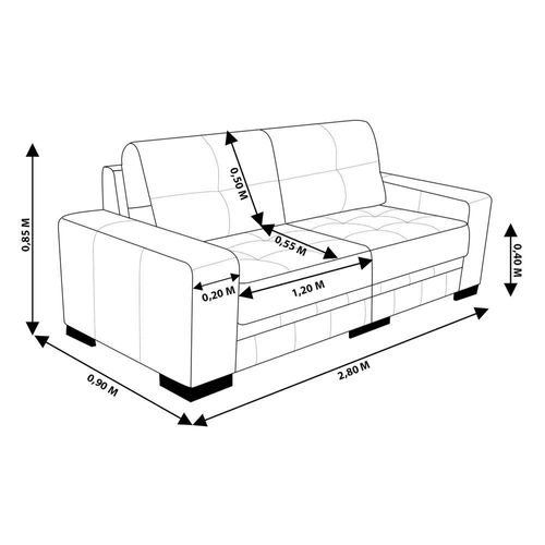 Dimensões do Produto: Largura: 280cm; Altura: 85cm; Profundidade: 90cm; Profundidade do Assento: 55cm; Largura do Assento: 120cm; Altura do Assento ao Chão: 40cm; Altura do Encosto: 50cm;