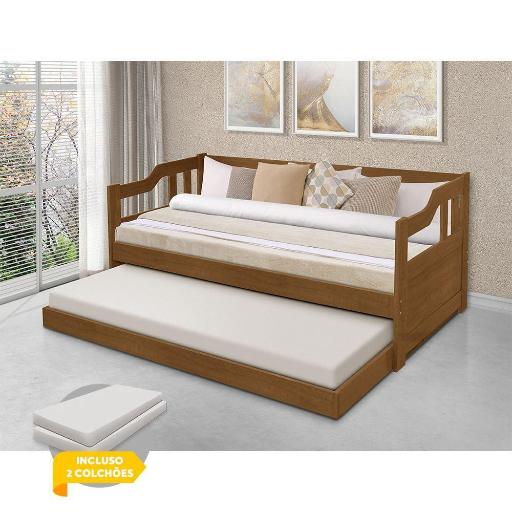 Sofá Cama Solteiro Com Cama Auxiliar Madeira Maciça - Kit 2 Atraente - Imbuia - Cor: Marrom
