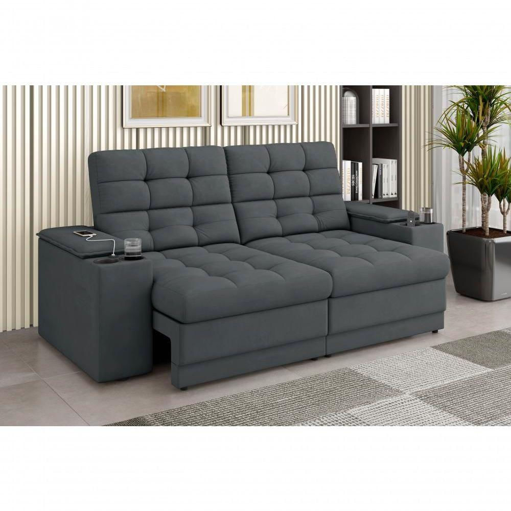 Sofá Confort Premium 2,05m Assento Retrátil-reclinável Porta Copos E Usb Suede Cinza - X Sofas